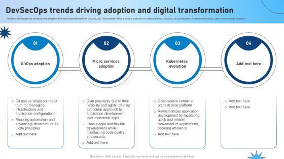 This slide showcases the trends driving adoption and digital transformation in DevSecOps. The purpose of this slide is to highlight the various trends, including third-party risk management, infrastructure as a code, growing reliance on AIOps, and shift to cloud native. Explore a selection of the finest Devsecops Trends Driving Adoption And Digital Transformation Role Of Devsecops Ppt Powerpoint here. With a plethora of professionally designed and pre-made slide templates, you can quickly and easily find the right one for your upcoming presentation. You can use our Devsecops Trends Driving Adoption And Digital Transformation Role Of Devsecops Ppt Powerpoint to effectively convey your message to a wider audience. Slidegeeks has done a lot of research before preparing these presentation templates. The content can be personalized and the slides are highly editable. Grab templates today from Slidegeeks. This slide showcases the trends driving adoption and digital transformation in DevSecOps. The purpose of this slide is to highlight the various trends, including third-party risk management, infrastructure as a code, growing reliance on AIOps, and shift to cloud native.
