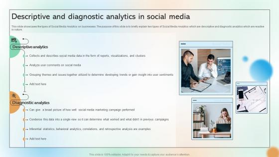 This slide showcases the types of Social Media Analytics on businesses. The purpose of this slide is to briefly explain two types of Social Media Analytics which are descriptive and diagnostic analytics which are reactive in nature. Slidegeeks is one of the best resources for PowerPoint templates. You can download easily and regulate Descriptive And Diagnostic Analytics In Social Media Cracking The Code Of Social Media for your personal presentations from our wonderful collection. A few clicks is all it takes to discover and get the most relevant and appropriate templates. Use our Templates to add a unique zing and appeal to your presentation and meetings. All the slides are easy to edit and you can use them even for advertisement purposes. This slide showcases the types of Social Media Analytics on businesses. The purpose of this slide is to briefly explain two types of Social Media Analytics which are descriptive and diagnostic analytics which are reactive in nature.