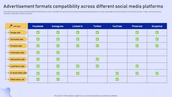 This slide showcase various advertisement formats that are used by marketers to increase brand awareness and generate leads from social media platforms. Key formats of social media ads are - image, carousel, product, collection, interactive lead forms ads etc. Create an editable Advertisement Formats Compatibility Across Different Social Media Platforms Ppt PowerPoint Presentation File Example PDF that communicates your idea and engages your audience. Whether youre presenting a business or an educational presentation, pre designed presentation templates help save time. Advertisement Formats Compatibility Across Different Social Media Platforms Ppt PowerPoint Presentation File Example PDF is highly customizable and very easy to edit, covering many different styles from creative to business presentations. Slidegeeks has creative team members who have crafted amazing templates. So, go and get them without any delay.