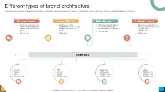 This slide showcases different types of brand architecture under which organizations operate. It includes branded houses, houses of brands, hybrid brand, and endorsed brand architecture. This Creating And Implementing A Powerful Brand Leadership Strategy Different Types Of Brand Rules PDF is perfect for any presentation, be it in front of clients or colleagues. It is a versatile and stylish solution for organizing your meetings. The product features a modern design for your presentation meetings. The adjustable and customizable slides provide unlimited possibilities for acing up your presentation. Slidegeeks has done all the homework before launching the product for you. So, do not wait, grab the presentation templates today