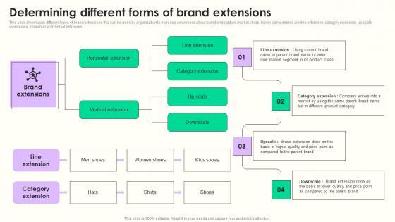 This slide showcases different types of brand extensions that can be used by organization to increase awareness about brand and capture market share. Its key components are line extension, category extension, up scale, downscale, horizontal and vertical extension. Crafting an eye-catching presentation has never been more straightforward. Let your presentation shine with this tasteful yet straightforward Brand Marketing Strategy Determining Different Forms Of Brand Extensions Clipart PDF template. It offers a minimalistic and classy look that is great for making a statement. The colors have been employed intelligently to add a bit of playfulness while still remaining professional. Construct the ideal Brand Marketing Strategy Determining Different Forms Of Brand Extensions Clipart PDF that effortlessly grabs the attention of your audience Begin now and be certain to wow your customers.