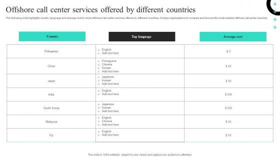 The following slide highlights country, language and average cost to show offshore call center services offered by different countries. It helps organizations to compare and choose the most suitable offshore call center services. Showcasing this set of slides titled Offshore Call Center Services Offered By Different Countries Sample Pdf. The topics addressed in these templates are Language And Average Cost, Call Center Services, Organizations To Compare. All the content presented in this PPT design is completely editable. Download it and make adjustments in color, background, font etc. as per your unique business setting. The following slide highlights country, language and average cost to show offshore call center services offered by different countries. It helps organizations to compare and choose the most suitable offshore call center services.