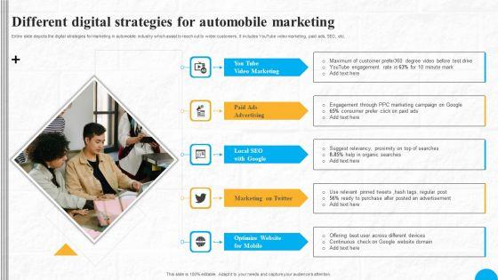 Entire slide depicts the digital strategies for marketing in automobile industry which assist to reach out to wider customers . It includes YouTube video marketing, paid ads, SEO, etc. Presenting Different Digital Strategies For Automobile Marketing Information PDF to dispense important information. This template comprises five stages. It also presents valuable insights into the topics including You Tube Video Marketing, Paid Ads Advertising, Local SEO With Google. This is a completely customizable PowerPoint theme that can be put to use immediately. So, download it and address the topic impactfully.