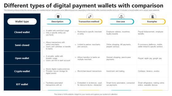 The following slide provides the various types of e-wallets that are designed to serve different purposes depending on the needs of the business and the end user. It includes a closed wallet, semi-closed, open wallet etc. Slidegeeks is here to make your presentations a breeze with Different Types Of Digital Payment Wallets With In Depth Guide To Digital Wallets Fin SS V With our easy-to-use and customizable templates, you can focus on delivering your ideas rather than worrying about formatting. With a variety of designs to choose from, you are sure to find one that suits your needs. And with animations and unique photos, illustrations, and fonts, you can make your presentation pop. So whether you are giving a sales pitch or presenting to the board, make sure to check out Slidegeeks first The following slide provides the various types of e-wallets that are designed to serve different purposes depending on the needs of the business and the end user. It includes a closed wallet, semi-closed, open wallet etc.