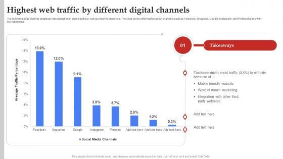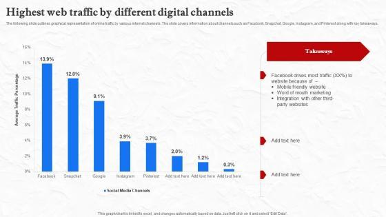 The following slide outlines graphical representation of online traffic by various internet channels. The slide covers information about channels such as Facebook, Snapchat, Google, Instagram, and Pinterest along with key takeaways. The best PPT templates are a great way to save time, energy, and resources. Slidegeeks have 100 percent editable powerpoint slides making them incredibly versatile. With these quality presentation templates, you can create a captivating and memorable presentation by combining visually appealing slides and effectively communicating your message. Download Facebook Marketing Techniques Highest Web Traffic By Different Digital Channels Strategy SS V from Slidegeeks and deliver a wonderful presentation. The following slide outlines graphical representation of online traffic by various internet channels. The slide covers information about channels such as Facebook, Snapchat, Google, Instagram, and Pinterest along with key takeaways.