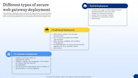 This slide demonstrates the various kinds of SWG deployments. The purpose of this slide is to explain the different types of Secure Web Gateway deployment methods such as on-premises deployment, cloud-based deployment and hybrid deployment. Do you have an important presentation coming up Are you looking for something that will make your presentation stand out from the rest Look no further than Different Types Of Secure Web Gateway Deployment Web Threat Protection System. With our professional designs, you can trust that your presentation will pop and make delivering it a smooth process. And with Slidegeeks, you can trust that your presentation will be unique and memorable. So why wait Grab Different Types Of Secure Web Gateway Deployment Web Threat Protection System today and make your presentation stand out from the rest This slide demonstrates the various kinds of SWG deployments. The purpose of this slide is to explain the different types of Secure Web Gateway deployment methods such as on-premises deployment, cloud-based deployment and hybrid deployment.