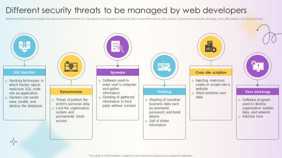 Mentioned slide provides insights into various security threats to be managed by web designers. It includes key components such as SQL injection, ransomware, spyware, phishing, cross site scription, and virus and bugs. Coming up with a presentation necessitates that the majority of the effort goes into the content and the message you intend to convey. The visuals of a PowerPoint presentation can only be effective if it supplements and supports the story that is being told. Keeping this in mind our experts created Managing Technical And Non Different Security Threats To Be Managed By Web Developers to reduce the time that goes into designing the presentation. This way, you can concentrate on the message while our designers take care of providing you with the right template for the situation. Mentioned slide provides insights into various security threats to be managed by web designers. It includes key components such as SQL injection, ransomware, spyware, phishing, cross site scription, and virus and bugs.
