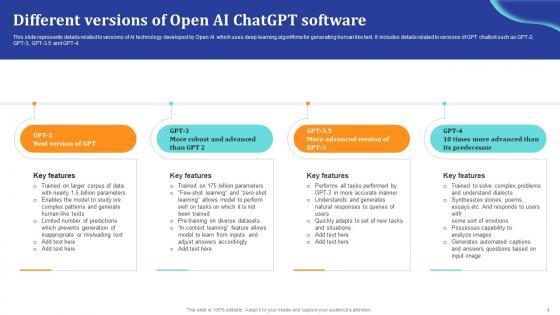 This slide represents details related to versions of AI technology developed by Open AI which uses deep learning algorithms for generating human like text. It includes details related to versions of GPT chatbot such as GPT-2, GPT-3, GPT-3.5 and GPT-4. The best PPT templates are a great way to save time, energy, and resources. Slidegeeks have 100 percent editable powerpoint slides making them incredibly versatile. With these quality presentation templates, you can create a captivating and memorable presentation by combining visually appealing slides and effectively communicating your message. Download ChatGpt Comprehensive Guide Different Versions Of Open Ai ChatGpt Ppt Template ChatGpt SS V from Slidegeeks and deliver a wonderful presentation. This slide represents details related to versions of AI technology developed by Open AI which uses deep learning algorithms for generating human like text. It includes details related to versions of GPT chatbot such as GPT-2, GPT-3, GPT-3.5 and GPT-4.