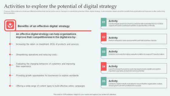 Purpose of this slide is to showcase different activities that can be performed by managers to identify the potential of their digital strategy. It also includes details about the benefits that organization will experience after performing these activities. Explore a selection of the finest Activities To Explore The Potential Digital Approaches To Increase Business Growth Template Pdf here. With a plethora of professionally designed and pre made slide templates, you can quickly and easily find the right one for your upcoming presentation. You can use our Activities To Explore The Potential Digital Approaches To Increase Business Growth Template Pdf to effectively convey your message to a wider audience. Slidegeeks has done a lot of research before preparing these presentation templates. The content can be personalized and the slides are highly editable. Grab templates today from Slidegeeks. Purpose of this slide is to showcase different activities that can be performed by managers to identify the potential of their digital strategy. It also includes details about the benefits that organization will experience after performing these activities.