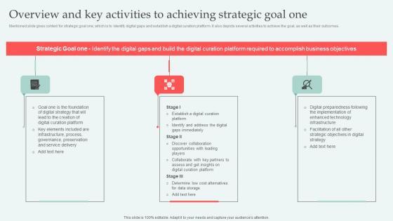 Mentioned slide gives context for strategic goal one, which is to identify digital gaps and establish a digital curation platform. It also depicts several activities to achieve the goal, as well as their outcomes. Slidegeeks has constructed Implementing Digital Transformation Overview And Key Activities To Achieving Strategic Goal One Topics PDF after conducting extensive research and examination. These presentation templates are constantly being generated and modified based on user preferences and critiques from editors. Here, you will find the most attractive templates for a range of purposes while taking into account ratings and remarks from users regarding the content. This is an excellent jumping-off point to explore our content and will give new users an insight into our top-notch PowerPoint Templates.