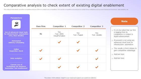 This slide provide details about the competitive analysis of firm in context to its competitors. Firm and its competitors are analyzed on certain force multipliers such as use of advanced cloud tools, data analytics, etc. Do you have to make sure that everyone on your team knows about any specific topic I yes, then you should give Digital Advancement Checklist Comparative Analysis To Check Extent Of Existing Digital Brochure Pdf a try. Our experts have put a lot of knowledge and effort into creating this impeccable Digital Advancement Checklist Comparative Analysis To Check Extent Of Existing Digital Brochure Pdf. You can use this template for your upcoming presentations, as the slides are perfect to represent even the tiniest detail. You can download these templates from the Slidegeeks website and these are easy to edit. So grab these today. This slide provide details about the competitive analysis of firm in context to its competitors. Firm and its competitors are analyzed on certain force multipliers such as use of advanced cloud tools, data analytics, etc.