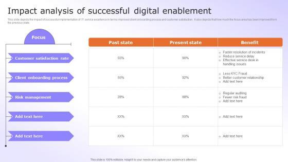 This slide depicts the impact of successful implementation of IT service excellence in terms improved client onboarding process and customer satisfaction. It also depicts that how much the focus area has been improved from the previous state. Crafting an eye-catching presentation has never been more straightforward. Let your presentation shine with this tasteful yet straightforward Digital Advancement Checklist Impact Analysis Of Successful Digital Enablement Professional Pdf template. It offers a minimalistic and classy look that is great for making a statement. The colors have been employed intelligently to add a bit of playfulness while still remaining professional. Construct the ideal Digital Advancement Checklist Impact Analysis Of Successful Digital Enablement Professional Pdf that effortlessly grabs the attention of your audience. Begin now and be certain to wow your customers. This slide depicts the impact of successful implementation of IT service excellence in terms improved client onboarding process and customer satisfaction. It also depicts that how much the focus area has been improved from the previous state.