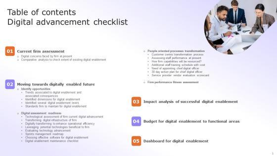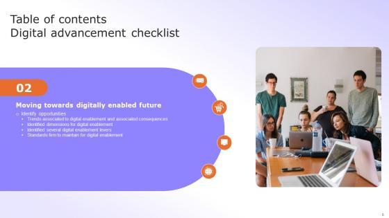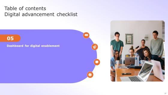 Are you searching for a Table Of Contents Digital Advancement Checklist Formats Pdf that is uncluttered, straightforward, and original It is easy to edit, and you can change the colors to suit your personal or business branding. For a presentation that expresses how much effort you have put in, this template is ideal With all of its features, including tables, diagrams, statistics, and lists, it is perfect for a business plan presentation. Make your ideas more appealing with these professional slides. Download Table Of Contents Digital Advancement Checklist Formats Pdf from Slidegeeks today. Our Table Of Contents Digital Advancement Checklist Formats Pdf are topically designed to provide an attractive backdrop to any subject. Use them to look like a presentation pro.