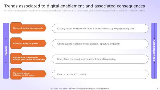 This slide provide details about the various trends that are existing in context to digital enablement such as advanced analytics growth, machine learning improvements and consequences associated to each trend. The best PPT templates are a great way to save time, energy, and resources. Slidegeeks have 100 percent editable powerpoint slides making them incredibly versatile. With these quality presentation templates, you can create a captivating and memorable presentation by combining visually appealing slides and effectively communicating your message. Download Digital Advancement Checklist Trends Associated To Digital Enablement Pictures Pdf from Slidegeeks and deliver a wonderful presentation. This slide provide details about the various trends that are existing in context to digital enablement such as advanced analytics growth, machine learning improvements and consequences associated to each trend.