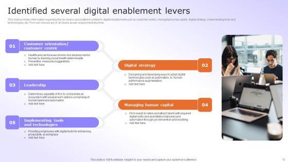 This slide provides information regarding the key levers associated in context to digital enablement such as customer centric, managing human capital, digital strategy, implementing tools and technologies, etc. Firm can choose any or all levers as per requirement at a time. Are you in need of a template that can accommodate all of your creative concepts This one is crafted professionally and can be altered to fit any style. Use it with Google Slides or PowerPoint. Include striking photographs, symbols, depictions, and other visuals. Fill, move around, or remove text boxes as desired. Test out color palettes and font mixtures. Edit and save your work, or work with colleagues. Download Digital Advancement Checklist Identified Several Digital Enablement Levers Formats Pdf and observe how to make your presentation outstanding. Give an impeccable presentation to your group and make your presentation unforgettable. This slide provides information regarding the key levers associated in context to digital enablement such as customer centric, managing human capital, digital strategy, implementing tools and technologies, etc. Firm can choose any or all levers as per requirement at a time.