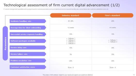 IT service management capabilities will be judged based on several parameters such as incidents and service requests handling rate, service failure rate, customer satisfaction score, etc. Welcome to our selection of the Digital Advancement Checklist Technological Assessment Of Firm Current Digital Information Pdf. These are designed to help you showcase your creativity and bring your sphere to life. Planning and Innovation are essential for any business that is just starting out. This collection contains the designs that you need for your everyday presentations. All of our PowerPoints are 100 percent editable, so you can customize them to suit your needs. This multi-purpose template can be used in various situations. Grab these presentation templates today. IT service management capabilities will be judged based on several parameters such as incidents and service requests handling rate, service failure rate, customer satisfaction score, etc.