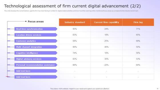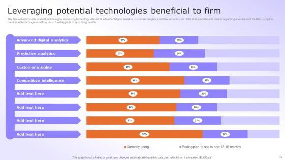 The firm will optimize its overall functioning by embracing technology in terms of advanced digital analytics, customer insights, predictive analytics, etc. This slide provides information regarding at what extent the firm using the mentioned technologies and how much it will upgrade in upcoming months. Make sure to capture your audiences attention in your business displays with our gratis customizable Digital Advancement Checklist Leveraging Potential Technologies Beneficial To Firm Introduction Pdf. These are great for business strategies, office conferences, capital raising or task suggestions. If you desire to acquire more customers for your tech business and ensure they stay satisfied, create your own sales presentation with these plain slides. The firm will optimize its overall functioning by embracing technology in terms of advanced digital analytics, customer insights, predictive analytics, etc. This slide provides information regarding at what extent the firm using the mentioned technologies and how much it will upgrade in upcoming months.
