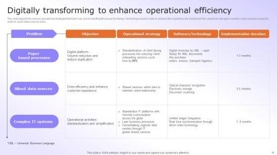 The slide depicts the various operational strategies that bank can use in handling the issue it is facing. Technology used in order to achieve the objectives are mentioned like electronic storage is used to make services shared in order to avoid data sources silos. Do you have an important presentation coming up Are you looking for something that will make your presentation stand out from the rest Look no further than Digital Advancement Checklist Digitally Transforming To Enhance Operational Demonstration Pdf. With our professional designs, you can trust that your presentation will pop and make delivering it a smooth process. And with Slidegeeks, you can trust that your presentation will be unique and memorable. So why wait Grab Digital Advancement Checklist Digitally Transforming To Enhance Operational Demonstration Pdf today and make your presentation stand out from the rest. The slide depicts the various operational strategies that bank can use in handling the issue it is facing. Technology used in order to achieve the objectives are mentioned like electronic storage is used to make services shared in order to avoid data sources silos.