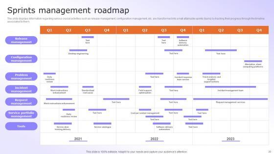 The slide displays information regarding various crucial activities such as release management, configuration management, etc. are transformed into small attainable sprints tasks by tracking their progress through the timeline associated to them. This modern and well-arranged Digital Advancement Checklist Sprints Management Roadmap Rules Pdf provides lots of creative possibilities. It is very simple to customize and edit with the Powerpoint Software. Just drag and drop your pictures into the shapes. All facets of this template can be edited with Powerpoint no extra software is necessary. Add your own material, put your images in the places assigned for them, adjust the colors, and then you can show your slides to the world, with an animated slide included. The slide displays information regarding various crucial activities such as release management, configuration management, etc. are transformed into small attainable sprints tasks by tracking their progress through the timeline associated to them.