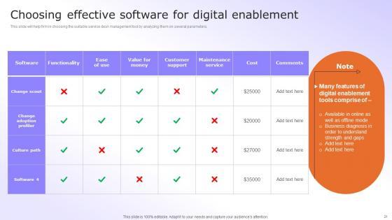 This slide will help firm in choosing the suitable service desk management tool by analyzing them on several parameters. There are so many reasons you need a Digital Advancement Checklist Choosing Effective Software For Digital Enablement Topics Pdf. The first reason is you can not spend time making everything from scratch, Thus, Slidegeeks has made presentation templates for you too. You can easily download these templates from our website easily. This slide will help firm in choosing the suitable service desk management tool by analyzing them on several parameters.