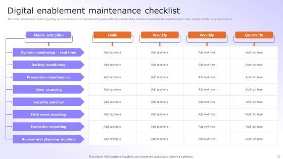 This slide provides information regarding service maintenance checklist that is prepared for the client and the activities mentioned will be performed on daily, weekly, monthly or quarterly basis. Slidegeeks is here to make your presentations a breeze with Digital Advancement Checklist Digital Enablement Maintenance Checklist Brochure Pdf With our easy-to-use and customizable templates, you can focus on delivering your ideas rather than worrying about formatting. With a variety of designs to choose from, you are sure to find one that suits your needs. And with animations and unique photos, illustrations, and fonts, you can make your presentation pop. So whether you are giving a sales pitch or presenting to the board, make sure to check out Slidegeeks first. This slide provides information regarding service maintenance checklist that is prepared for the client and the activities mentioned will be performed on daily, weekly, monthly or quarterly basis.