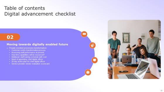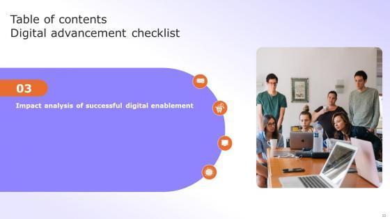 Find highly impressive Digital Advancement Checklist For Table Of Contents Topics Pdf on Slidegeeks to deliver a meaningful presentation. You can save an ample amount of time using these presentation templates. No need to worry to prepare everything from scratch because Slidegeeks experts have already done a huge research and work for you. You need to download Digital Advancement Checklist For Table Of Contents Topics Pdf for your upcoming presentation. All the presentation templates are 100 percent editable and you can change the color and personalize the content accordingly. Download now. Our Digital Advancement Checklist For Table Of Contents Topics Pdf are topically designed to provide an attractive backdrop to any subject. Use them to look like a presentation pro.