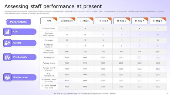 This slide helps in analyzing the performance of different executives or representatives. It will help in tracking metrics such as cost per contact, percentage of tickets opened, etc. The staff performance will be assessed on various parameters such as cost, quality, productivity and service level. Slidegeeks is one of the best resources for PowerPoint templates. You can download easily and regulate Digital Advancement Checklist Assessing Staff Performance At Present Elements Pdf for your personal presentations from our wonderful collection. A few clicks is all it takes to discover and get the most relevant and appropriate templates. Use our Templates to add a unique zing and appeal to your presentation and meetings. All the slides are easy to edit and you can use them even for advertisement purposes. This slide helps in analyzing the performance of different executives or representatives. It will help in tracking metrics such as cost per contact, percentage of tickets opened, etc. The staff performance will be assessed on various parameters such as cost, quality, productivity and service level.
