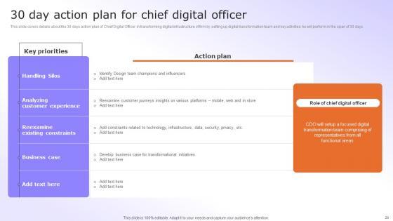 This slide covers details about the 30 days action plan of Chief Digital Officer in transforming digital infrastructure of firm by setting up digital transformation team and key activities he will perform in the span of 30 days. Boost your pitch with our creative Digital Advancement Checklist 30 Day Action Plan For Chief Digital Officer Infographics Pdf. Deliver an awe-inspiring pitch that will mesmerize everyone. Using these presentation templates you will surely catch everyones attention. You can browse the ppts collection on our website. We have researchers who are experts at creating the right content for the templates. So you do not have to invest time in any additional work. Just grab the template now and use them. This slide covers details about the 30 days action plan of Chief Digital Officer in transforming digital infrastructure of firm by setting up digital transformation team and key activities he will perform in the span of 30 days.