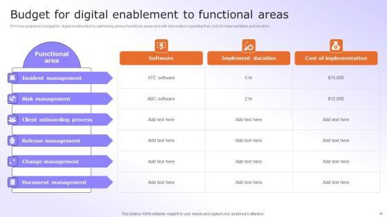 Firm has prepared a budget for digital enablement by optimizing various functional areas and with information regarding their cost of implementation and duration. Want to ace your presentation in front of a live audience Our Digital Advancement Checklist Budget For Digital Enablement To Functional Areas Elements Pdf can help you do that by engaging all the users towards you. Slidegeeks experts have put their efforts and expertise into creating these impeccable powerpoint presentations so that you can communicate your ideas clearly. Moreover, all the templates are customizable, and easy-to-edit and downloadable. Use these for both personal and commercial use. Firm has prepared a budget for digital enablement by optimizing various functional areas and with information regarding their cost of implementation and duration.
