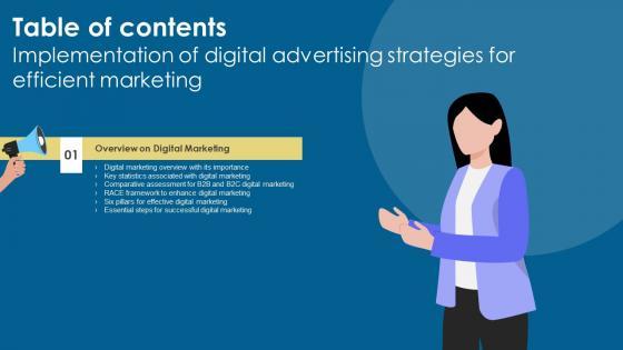 Here you can discover an assortment of the finest PowerPoint and Google Slides templates. With these templates, you can create presentations for a variety of purposes while simultaneously providing your audience with an eye catching visual experience. Download Implementation Of Digital Advertising Strategies Table Of Contents Background Pdf to deliver an impeccable presentation. These templates will make your job of preparing presentations much quicker, yet still, maintain a high level of quality. Slidegeeks has experienced researchers who prepare these templates and write high quality content for you. Later on, you can personalize the content by editing the Implementation Of Digital Advertising Strategies For Efficient Marketing Table Of Contents Background Pdf. Our Implementation Of Digital Advertising Strategies Table Of Contents Background Pdf are topically designed to provide an attractive backdrop to any subject. Use them to look like a presentation pro.