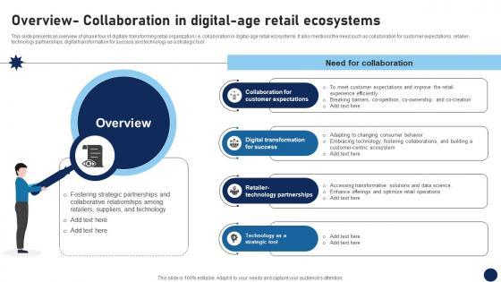This slide presents an overview of phase four of digitally transforming retail organization i.e. collaboration in digital-age retail ecosystems. It also mentions the need such as collaboration for customer expectations, retailer-technology partnerships, digital transformation for success and technology as a strategic tool.Slidegeeks is here to make your presentations a breeze with Overview Collaboration In Digital Age Retail Ecosystems DT SS V With our easy-to-use and customizable templates, you can focus on delivering your ideas rather than worrying about formatting. With a variety of designs to choose from, you are sure to find one that suits your needs. And with animations and unique photos, illustrations, and fonts, you can make your presentation pop. So whether you are giving a sales pitch or presenting to the board, make sure to check out Slidegeeks first This slide presents an overview of phase four of digitally transforming retail organization i.e. collaboration in digital-age retail ecosystems. It also mentions the need such as collaboration for customer expectations, retailer-technology partnerships, digital transformation for success and technology as a strategic tool.