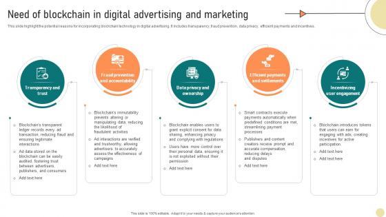 This slide highlight the potential reasons for incorporating blockchain technology in digital advertising. It includes transparency, fraud prevention, data privacy, efficient payments and incentives. Create an editable Visionary Guide To Blockchain Need Of Blockchain In Digital Advertising And Marketing BCT SS V that communicates your idea and engages your audience. Whether you are presenting a business or an educational presentation, pre-designed presentation templates help save time. Visionary Guide To Blockchain Need Of Blockchain In Digital Advertising And Marketing BCT SS V is highly customizable and very easy to edit, covering many different styles from creative to business presentations. Slidegeeks has creative team members who have crafted amazing templates. So, go and get them without any delay. This slide highlight the potential reasons for incorporating blockchain technology in digital advertising. It includes transparency, fraud prevention, data privacy, efficient payments and incentives.
