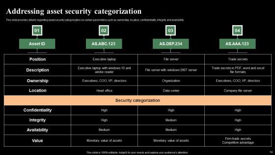 This slide provides details regarding asset security categorization on certain parameters such as ownership, location, confidentiality, integrity and availability. Retrieve professionally designed Addressing Asset Security Categorization Monitoring Digital Assets Slides Pdf to effectively convey your message and captivate your listeners. Save time by selecting pre-made slideshows that are appropriate for various topics, from business to educational purposes. These themes come in many different styles, from creative to corporate, and all of them are easily adjustable and can be edited quickly. Access them as PowerPoint templates or as Google Slides themes. You do not have to go on a hunt for the perfect presentation because Slidegeeks got you covered from everywhere. This slide provides details regarding asset security categorization on certain parameters such as ownership, location, confidentiality, integrity and availability.