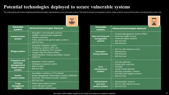 This slide portrays information regarding potential technologies implemented to secure vulnerable systems. The systems include communication systems, bridge systems, access control system, core infrastructure system, etc. From laying roadmaps to briefing everything in detail, our templates are perfect for you. You can set the stage with your presentation slides. All you have to do is download these easy-to-edit and customizable templates. Potential Technologies Deployed To Secure Vulnerable Monitoring Digital Assets Summary Pdf will help you deliver an outstanding performance that everyone would remember and praise you for. Do download this presentation today. This slide portrays information regarding potential technologies implemented to secure vulnerable systems. The systems include communication systems, bridge systems, access control system, core infrastructure system, etc.