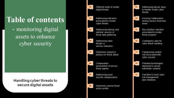 Present like a pro with Table Of Contents Monitoring Digital Assets To Enhance Cyber Security Slides Pdf Create beautiful presentations together with your team, using our easy-to-use presentation slides. Share your ideas in real-time and make changes on the fly by downloading our templates. So whether you are in the office, on the go, or in a remote location, you can stay in sync with your team and present your ideas with confidence. With Slidegeeks presentation got a whole lot easier. Grab these presentations today. Our Table Of Contents Monitoring Digital Assets To Enhance Cyber Security Slides Pdf are topically designed to provide an attractive backdrop to any subject. Use them to look like a presentation pro.