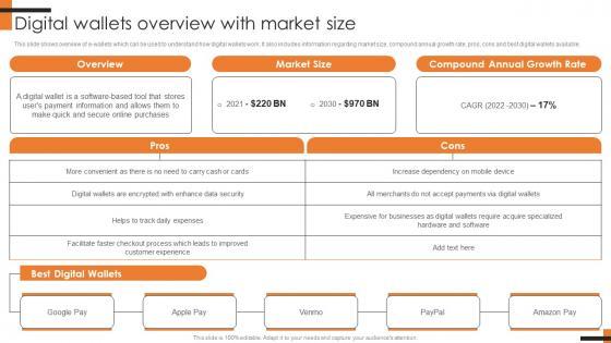 This slide shows overview of e-wallets which can be used to understand how digital wallets work. It also includes information regarding market size, compound annual growth rate, pros, cons and best digital wallets available. Explore a selection of the finest Wireless Banking To Improve Digital Wallets Overview With Market Size Fin SS V here. With a plethora of professionally designed and pre-made slide templates, you can quickly and easily find the right one for your upcoming presentation. You can use our Wireless Banking To Improve Digital Wallets Overview With Market Size Fin SS V to effectively convey your message to a wider audience. Slidegeeks has done a lot of research before preparing these presentation templates. The content can be personalized and the slides are highly editable. Grab templates today from Slidegeeks. This slide shows overview of e-wallets which can be used to understand how digital wallets work. It also includes information regarding market size, compound annual growth rate, pros, cons and best digital wallets available.