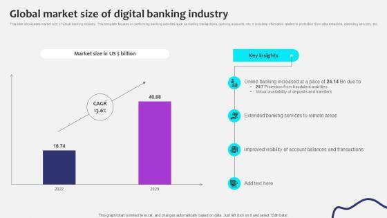 This slide showcases market size of virtual banking industry. This template focuses on performing banking activities such as making transactions, opening accounts, etc. It includes information related to protection from data breaches, extending services, etc. If your project calls for a presentation, then Slidegeeks is your go-to partner because we have professionally designed, easy-to-edit templates that are perfect for any presentation. After downloading, you can easily edit Global Market Size Of Digital Initiating Globalization Of Banking Ppt Sample and make the changes accordingly. You can rearrange slides or fill them with different images. Check out all the handy templates This slide showcases market size of virtual banking industry. This template focuses on performing banking activities such as making transactions, opening accounts, etc. It includes information related to protection from data breaches, extending services, etc.