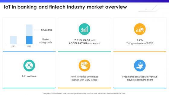 Are you in need of a template that can accommodate all of your creative concepts This one is crafted professionally and can be altered to fit any style. Use it with Google Slides or PowerPoint. Include striking photographs, symbols, depictions, and other visuals. Fill, move around, or remove text boxes as desired. Test out color palettes and font mixtures. Edit and save your work, or work with colleagues. Download IoT In Banking And Fintech Industry Market Overview IoT In Banking For Digital Future IoT SS V and observe how to make your presentation outstanding. Give an impeccable presentation to your group and make your presentation unforgettable. Our IoT In Banking And Fintech Industry Market Overview IoT In Banking For Digital Future IoT SS V are topically designed to provide an attractive backdrop to any subject. Use them to look like a presentation pro.
