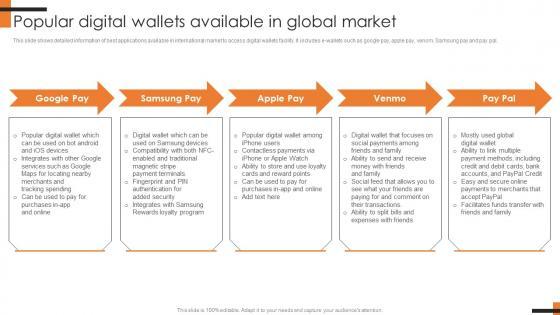 This slide shows detailed information of best applications available in international market to access digital wallets facility. It includes e-wallets such as google pay, apple pay, venom, Samsung pay and pay pal. Find highly impressive Wireless Banking To Improve Popular Digital Wallets Available In Global Market Fin SS V on Slidegeeks to deliver a meaningful presentation. You can save an ample amount of time using these presentation templates. No need to worry to prepare everything from scratch because Slidegeeks experts have already done a huge research and work for you. You need to download Wireless Banking To Improve Popular Digital Wallets Available In Global Market Fin SS V for your upcoming presentation. All the presentation templates are 100 percent editable and you can change the color and personalize the content accordingly. Download now This slide shows detailed information of best applications available in international market to access digital wallets facility. It includes e-wallets such as google pay, apple pay, venom, Samsung pay and pay pal.