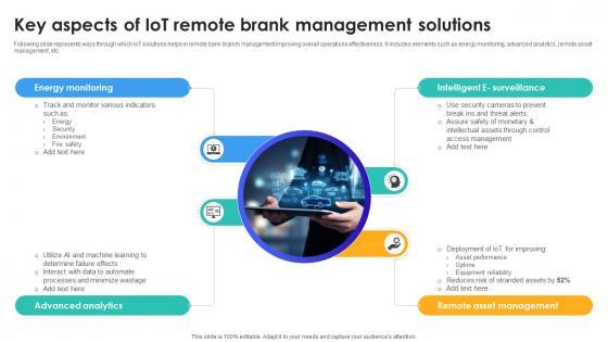 Following slide represents ways through which IoT solutions helps in remote bank branch management improving overall operations effectiveness. It includes elements such as energy monitoring, advanced analytics, remote asset management, etc. This Key Aspects Of IoT Remote Brank Management Solutions IoT In Banking For Digital Future IoT SS V is perfect for any presentation, be it in front of clients or colleagues. It is a versatile and stylish solution for organizing your meetings. The Key Aspects Of IoT Remote Brank Management Solutions IoT In Banking For Digital Future IoT SS V features a modern design for your presentation meetings. The adjustable and customizable slides provide unlimited possibilities for acing up your presentation. Slidegeeks has done all the homework before launching the product for you. So, do not wait, grab the presentation templates today Following slide represents ways through which IoT solutions helps in remote bank branch management improving overall operations effectiveness. It includes elements such as energy monitoring, advanced analytics, remote asset management, etc.