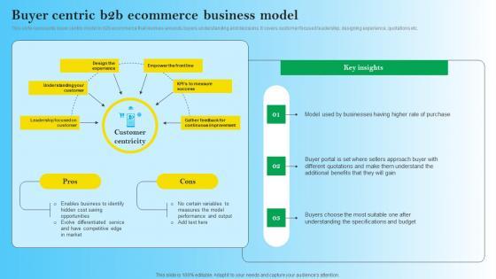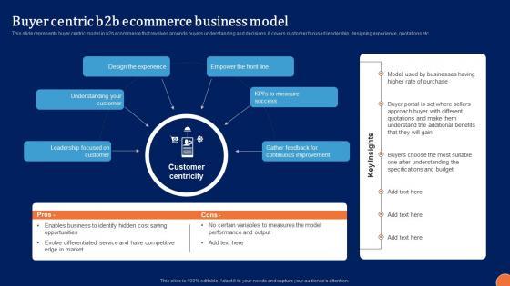 This slide represents buyer centric model in b2b ecommerce that revolves arounds buyers understanding and decisions. It covers customer focused leadership, designing experience, quotations etc. Slidegeeks is one of the best resources for PowerPoint templates. You can download easily and regulate Business To Business Digital Channel Management Buyer Centric B2B Ecommerce Business Model Summary PDF for your personal presentations from our wonderful collection. A few clicks is all it takes to discover and get the most relevant and appropriate templates. Use our Templates to add a unique zing and appeal to your presentation and meetings. All the slides are easy to edit and you can use them even for advertisement purposes.