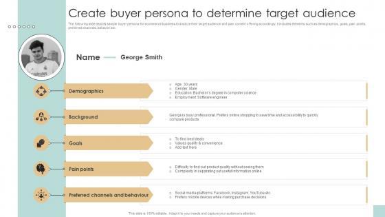 The following slide depicts sample buyer persona for ecommerce business to analyze their target audience and plan content offering accordingly. It includes elements such as demographics, goals, pain points, preferred channels, behavior etc. Slidegeeks is here to make your presentations a breeze with Create Buyer Persona To Determine Target Developing And Creating Digital Content Strategy SS V With our easy-to-use and customizable templates, you can focus on delivering your ideas rather than worrying about formatting. With a variety of designs to choose from, you are sure to find one that suits your needs. And with animations and unique photos, illustrations, and fonts, you can make your presentation pop. So whether you are giving a sales pitch or presenting to the board, make sure to check out Slidegeeks first The following slide depicts sample buyer persona for ecommerce business to analyze their target audience and plan content offering accordingly. It includes elements such as demographics, goals, pain points, preferred channels, behavior etc.