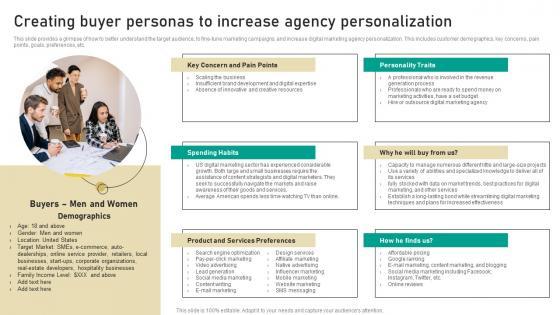 This slide provides a glimpse of how to better understand the target audience, to fine-tune marketing campaigns, and increase digital marketing agency personalization. This includes customer demographics, key concerns, pain points, goals, preferences, etc. Slidegeeks is here to make your presentations a breeze with Creating Buyer Personas To Increase Agency Digital Marketing Business Download Pdf With our easy-to-use and customizable templates, you can focus on delivering your ideas rather than worrying about formatting. With a variety of designs to choose from, you are sure to find one that suits your needs. And with animations and unique photos, illustrations, and fonts, you can make your presentation pop. So whether you are giving a sales pitch or presenting to the board, make sure to check out Slidegeeks first This slide provides a glimpse of how to better understand the target audience, to fine-tune marketing campaigns, and increase digital marketing agency personalization. This includes customer demographics, key concerns, pain points, goals, preferences, etc.