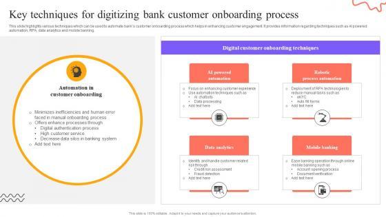 This slide highlights various techniques which can be used to automate banks customer onboarding process which helps in enhancing customer engagement. It provides information regarding techniques such as AI powered automation, RPA, data analytics and mobile banking. Slidegeeks is here to make your presentations a breeze with Digital Approach To Client Key Techniques For Digitizing Bank Customer Onboarding Process With our easy-to-use and customizable templates, you can focus on delivering your ideas rather than worrying about formatting. With a variety of designs to choose from, you are sure to find one that suits your needs. And with animations and unique photos, illustrations, and fonts, you can make your presentation pop. So whether you are giving a sales pitch or presenting to the board, make sure to check out Slidegeeks first This slide highlights various techniques which can be used to automate banks customer onboarding process which helps in enhancing customer engagement. It provides information regarding techniques such as AI powered automation, RPA, data analytics and mobile banking.