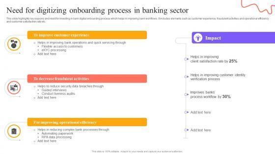 This slide highlights key reasons and need for investing in bank digital onboarding process which helps in improving bank workflows. It includes elements such as customer experience, fraudulent activities and operational efficiency and customer satisfaction rate etc. If you are looking for a format to display your unique thoughts, then the professionally designed Digital Approach To Client Need For Digitizing Onboarding Process In Banking Sector is the one for you. You can use it as a Google Slides template or a PowerPoint template. Incorporate impressive visuals, symbols, images, and other charts. Modify or reorganize the text boxes as you desire. Experiment with shade schemes and font pairings. Alter, share or cooperate with other people on your work. Download Digital Approach To Client Need For Digitizing Onboarding Process In Banking Sector and find out how to give a successful presentation. Present a perfect display to your team and make your presentation unforgettable. This slide highlights key reasons and need for investing in bank digital onboarding process which helps in improving bank workflows. It includes elements such as customer experience, fraudulent activities and operational efficiency and customer satisfaction rate etc.
