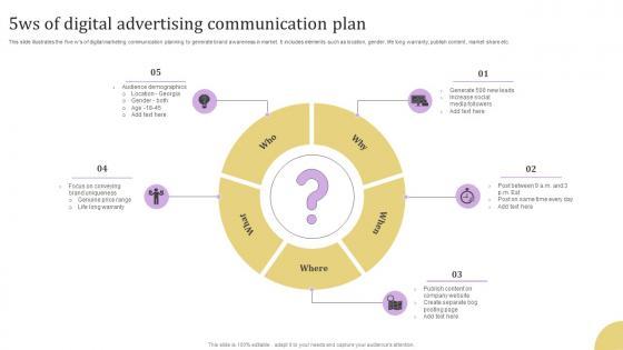 This slide illustrates the five ws of digital marketing communication planning to generate brand awareness in market. It includes elements such as location, gender, life long warranty, publish content , market share etc. Pitch your topic with ease and precision using this 5ws Of Digital Advertising Communication Plan Slides Pdf. This layout presents information on Audience Demographics, Focus On Conveying, Publish Content. It is also available for immediate download and adjustment. So, changes can be made in the color, design, graphics or any other component to create a unique layout. This slide illustrates the five ws of digital marketing communication planning to generate brand awareness in market. It includes elements such as location, gender, life long warranty, publish content , market share etc.