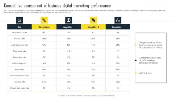 This slide showcases various comparison between own business and key competitors in market s to track and measure effectiveness of digital marketing strategies of business. It highlights metrics such as net promoter score, website traffic, leads generation rate, page views rate, conversion rate, click through rate, etc. Whether you have daily or monthly meetings, a brilliant presentation is necessary. Competitive Assessment Of Business Digital Efficient Plan For Conducting Competitor Formats Pdf can be your best option for delivering a presentation. Represent everything in detail using Competitive Assessment Of Business Digital Efficient Plan For Conducting Competitor Formats Pdf and make yourself stand out in meetings. The template is versatile and follows a structure that will cater to your requirements. All the templates prepared by Slidegeeks are easy to download and edit. Our research experts have taken care of the corporate themes as well. So, give it a try and see the results. This slide showcases various comparison between own business and key competitors in market s to track and measure effectiveness of digital marketing strategies of business. It highlights metrics such as net promoter score, website traffic, leads generation rate, page views rate, conversion rate, click through rate, etc.