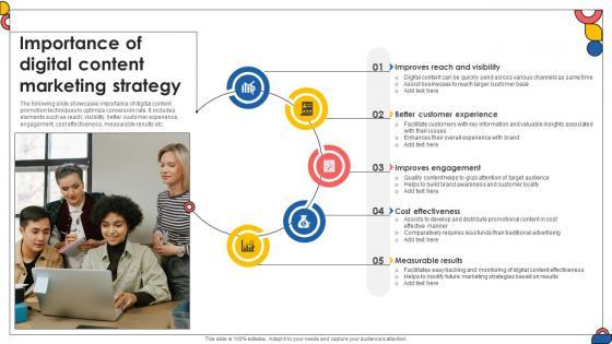 The following slide showcases importance of digital content promotion techniques to optimize conversion rate. It includes elements such as reach, visibility, better customer experience, engagement, cost effectiveness, measurable results etc.This modern and well-arranged Importance Of Digital Content Marketing Strategy Comprehensive Guide To Implement Strategy SS V provides lots of creative possibilities. It is very simple to customize and edit with the Powerpoint Software. Just drag and drop your pictures into the shapes. All facets of this template can be edited with Powerpoint, no extra software is necessary. Add your own material, put your images in the places assigned for them, adjust the colors, and then you can show your slides to the world, with an animated slide included. The following slide showcases importance of digital content promotion techniques to optimize conversion rate. It includes elements such as reach, visibility, better customer experience, engagement, cost effectiveness, measurable results etc.