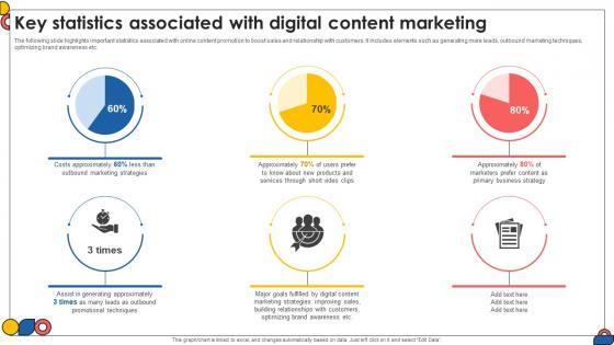 The following slide highlights important statistics associated with online content promotion to boost sales and relationship with customers. It includes elements such as generating more leads, outbound marketing techniques, optimizing brand awareness etc. Explore a selection of the finest Key Statistics Associated With Digital Content Marketing Comprehensive Guide To Implement Strategy SS V here. With a plethora of professionally designed and pre-made slide templates, you can quickly and easily find the right one for your upcoming presentation. You can use our Key Statistics Associated With Digital Content Marketing Comprehensive Guide To Implement Strategy SS V to effectively convey your message to a wider audience. Slidegeeks has done a lot of research before preparing these presentation templates. The content can be personalized and the slides are highly editable. Grab templates today from Slidegeeks. The following slide highlights important statistics associated with online content promotion to boost sales and relationship with customers. It includes elements such as generating more leads, outbound marketing techniques, optimizing brand awareness etc.
