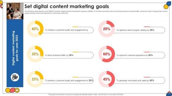 The following slide depicts some SMART goals for digital content marketing to organize activities. It includes elements such as brand awareness, business traffic, customer loyalty, engagement, search engine ranking, consumer experience, more leads, sales etc.Get a simple yet stunning designed Set Digital Content Marketing Goals Comprehensive Guide To Implement Strategy SS V. It is the best one to establish the tone in your meetings. It is an excellent way to make your presentations highly effective. So, download this PPT today from Slidegeeks and see the positive impacts. Our easy-to-edit Set Digital Content Marketing Goals Comprehensive Guide To Implement Strategy SS V can be your go-to option for all upcoming conferences and meetings. So, what are you waiting for Grab this template today. The following slide depicts some SMART goals for digital content marketing to organize activities. It includes elements such as brand awareness, business traffic, customer loyalty, engagement, search engine ranking, consumer experience, more leads, sales etc.